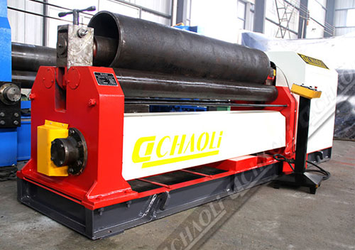 本機結構型式為三輥對稱式,上輥在兩下輥中央對稱位置作垂直升降運動,通過絲桿絲母蝸桿傳動而獲得,兩下輥作旋轉運動,通過 減速機的輸出齒輪與下輥齒嚙合,為卷制板材提供扭矩。本機床的缺陷是需借助其它設備實現預彎。本設備可卷板厚1mm-40mm,板寬8000mm的板料。